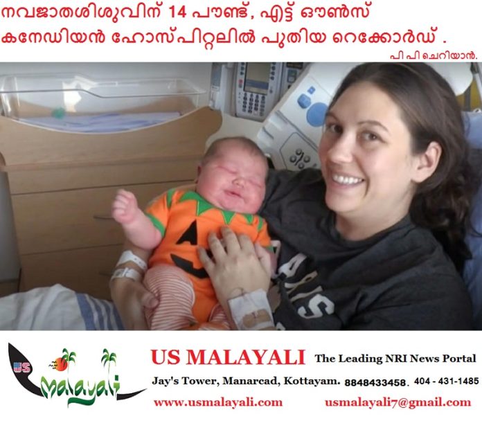 ഒന്റാറിയോ : ഹാലോവീൻ ഡെലിവറി തീയതിക്ക് ഒരാഴ്ച മുൻപ് അഞ്ച് കുട്ടികളുടെ അമ്മയായ ബ്രിറ്റേനി അയേഴ്സിനു ജനിച്ച , നവജാതശിശുവിന്റെ ഭാരം 14 പൗണ്ട്, എട്ട് ഔൺസ്.കുഞ്ഞു ആരോഗ്യവാനാണെന്നും സങ്കീർണതകളൊന്നുമില്ലെന്നും കുടുംബം പറഞ്ഞു.