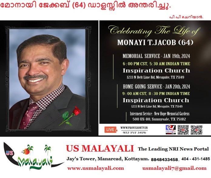 സണ്ണിവെയ്ൽ :ഡാളസ് മെട്രോപ്ലെക്സിലെ സർട്ടിഫൈഡ് പബ്ലിക് അക്കൗണ്ടന്റ് (സി പി എ) മോനായി ജേക്കബ് (64) ഡാളസ്സിൽ ഇന്ന് (ജനുവരി 17 ബുധനാഴ്ച ) അന്തരിച്ചു.അടിമാലി തേവർമഠത്തിൽ വർക്കി ജേക്കബ്-ഏലിയാമ്മ ജേക്കബിന്റെയും പത്തു മക്കളിൽ അഞ്ചാമനാണ് പരേതൻ .ഗാർലാൻഡ് ഫിലാഡെൽപിയ പെന്തകോസ്റ്റൽ ചര്ച്ച അംഗമാണ്