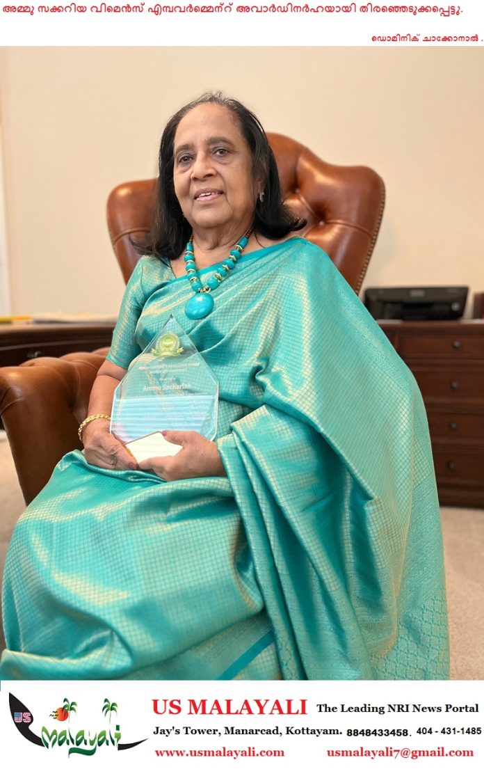 കവയത്രി യും എഴുത്തുകാരിയുമായ അമ്മു സക്കറിയായെ “വിമെൻസ് എംപവർമെന്റ്”അവാർഡ് നൽകി ആദരിച്ചു.വർഷങ്ങളായി തന്റെ തൂലിക തുമ്പിലൂടെ ലേഖനങ്ങൾ, കവിതകൾ, കഥകൾ എന്നിവ രചിക്കുന്ന ഒരതുലൃ പ്രതിഭയാണ് അമ്മു സക്കറിയ.അവർക്ക് ഈ അംഗീകാരം വളരെയധികം അർഹതപ്പെട്ടതാണെന്ന് റീജിയന്റെ.