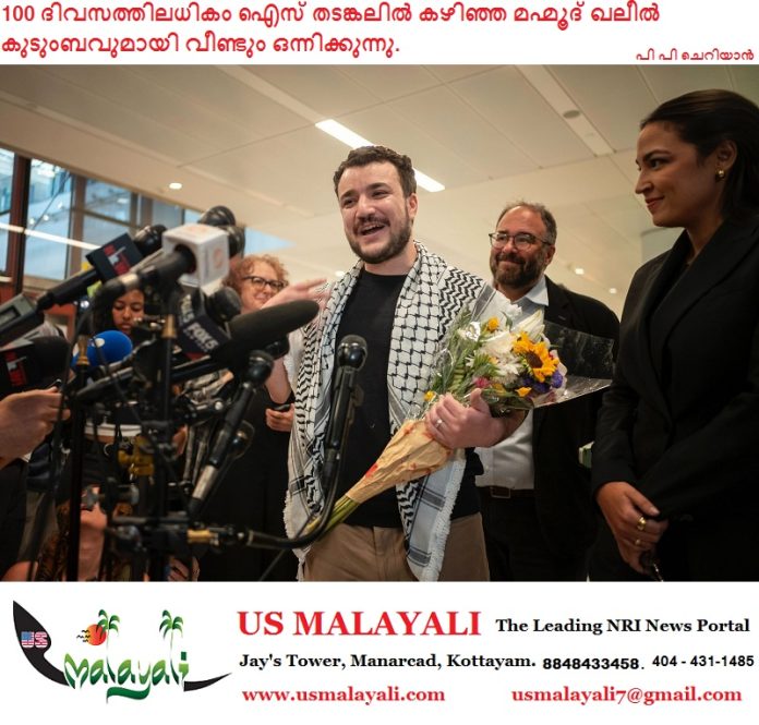 വാഷിംഗ്ടൺ ഡി സി :മൂന്ന് മാസത്തിലേറെയായി ഫെഡറൽ ഇമിഗ്രേഷൻ അധികാരികൾ തടവിലാക്കിയിരുന്ന പലസ്തീൻ അവകാശ പ്രവർത്തകനും കൊളംബിയ യൂണിവേഴ്സിറ്റി ബിരുദധാരിയും യുഎസിലെ നിയമപരമായ സ്ഥിര താമസക്കാരനുമായ മഹ്മൂദ് ഖലീൽ കുടുംബവുമായി വീണ്ടും ഒന്നിക്കുന്നു