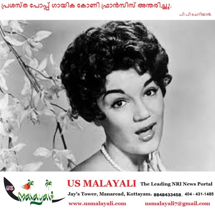 നാഷ്വില്ലെ, ടെന്നസി: 1950-കളിലും 60-കളിലും സംഗീത ലോകത്ത് തരംഗങ്ങൾ സൃഷ്ടിച്ച പ്രശസ്ത പോപ്പ് ഗായിക കോണി ഫ്രാൻസിസ് 87-ആം വയസ്സിൽ അന്തരിച്ചു. ജൂലൈ 17 വ്യാഴാഴ്ച, ഫ്രാൻസിസിന്റെ ദീർഘകാല സുഹൃത്തും കോൺസെറ്റ റെക്കോർഡ്സിന്റെ പ്രസിഡന്റുമായ റോൺ റോബർട്ട്സ് ഫേസ്ബുക്ക് പോസ്റ്റിലൂടെയാണ് മരണവിവരം അറിയിച്ചത്.