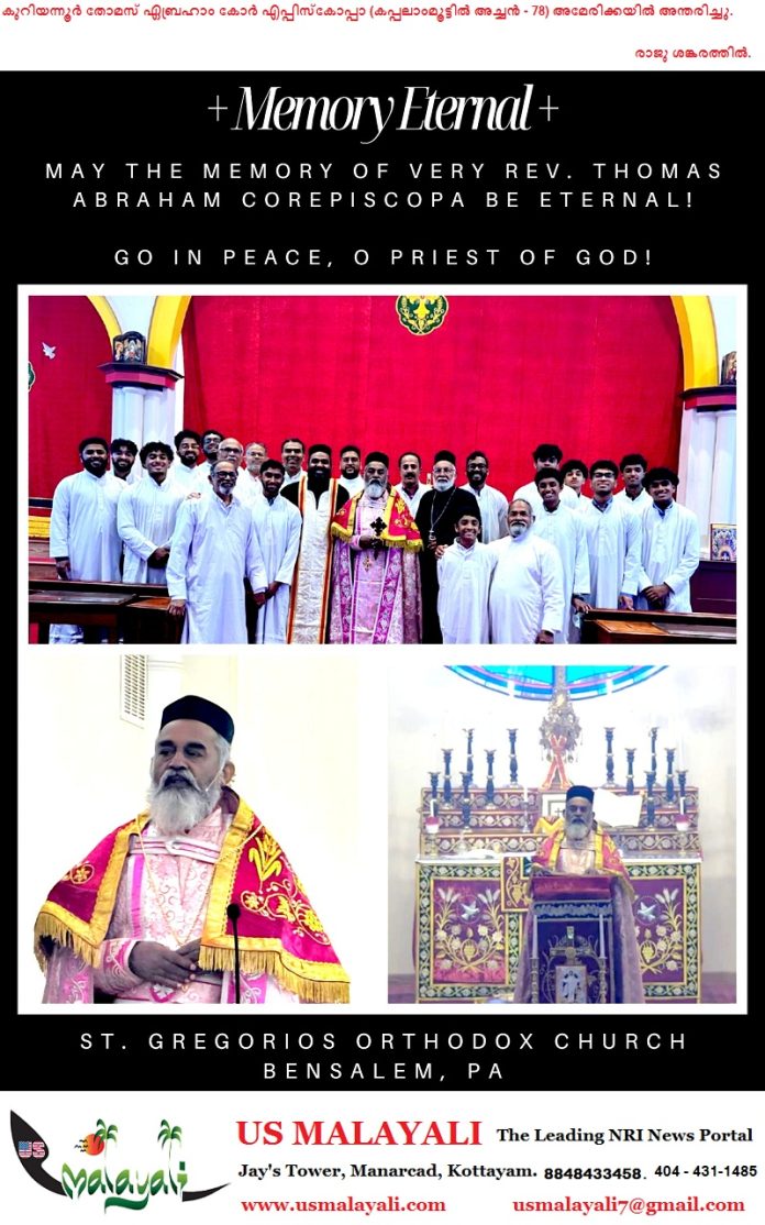 ഫിലഡൽഫിയ: കോട്ടയം ഭദ്രാസനത്തിലെ സീനിയർ വൈദീകനും, പഴയ സെമിനാരി മുൻ മാനേജരും, മീനടം സെൻറ് ജോർജ് ഓർത്തഡോക്സ് ഇടവക അംഗവും ആയിരുന്ന കുറിയന്നൂർ തോമസ് ഏബ്രഹാം കോർഎപ്പിസ്കോപ്പാ (78)