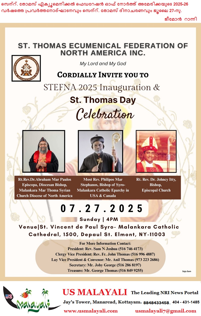 ന്യൂയോർക്ക് : ന്യൂയോർക്ക് ആസ്ഥാനമായി പ്രവർത്തിക്കുന്ന മലയാളി ക്രൈസ്തവ കൂട്ടായ്മയായ സെന്റ്. തോമസ് എക്യൂമെനിക്കൽ ഫെഡറേഷൻ ഓഫ് നോർത്ത് അമേരിക്ക (STEFNA) യുടെ 2025–26 വർഷത്തെ പ്രവർത്തനോദ്ഘാടനവും സെന്റ്. തോമസ് ദിനാചരണവും 2025 ജൂലൈ 27-നു, ഞായറാഴ്ച വൈകിട്ട് 4:00 മണിക്ക് സെൻറ്. വിൻസെൻറ് ഡി പോൾ സീറോ മലങ്കര കാത്തോലിക്ക കത്തീഡ്രൽ ദേവാലയത്തിൽ വെച്ചു നടക്കും.