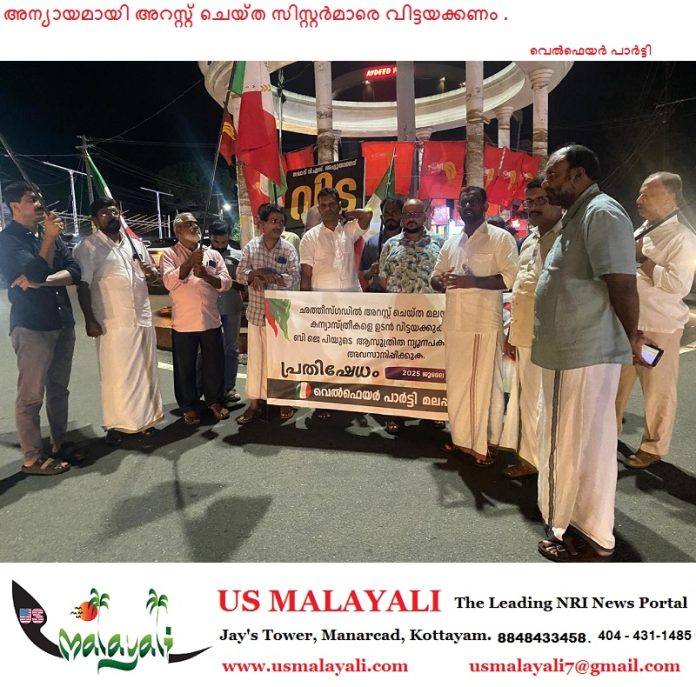 സംഘപരിവാറിന്റെ താൽപര്യം പരിഗണിച്ച് അറസ്റ്റ് ചെയ്ത നടപടി രാജ്യത്ത് ബിജെപി നടത്തി വരുന്ന ക്രിസ്ത്യൻ വേട്ടയുടെ ഭാഗമാണെന്ന് പ്രതിഷേധം ഉദ്ഘാടനം ചെയ്ത വെൽഫെയർ പാർട്ടി ജില്ലാ പ്രസിഡൻ്റ് കെവി സഫീർഷ പറഞ്ഞു. സംസ്ഥാന കമ്മിറ്റിയംഗം നാസർ കീഴ്പറമ്പ്, ജില്ലാ ജനറൽ സെക്രട്ടറി മുനീബ് കാരക്കുന്ന്, ജാഫർ സിസി, ഫ്രറ്റേണിറ്റി ജില്ലാ പ്രസിഡൻ്റ് വിടീഎസ് ഉമർ തങ്ങൾ, മണ്ഡലം വൈസ് പ്രസിഡൻ്റ് അഫ്സൽ, മുനിസിപ്പൽ സെക്രട്ടറി ഇർഫാൻ, അബ്ദുസ്സമദ് തൂമ്പത്ത് തുടങ്ങിയവർ നേതൃത്വം നൽകി.