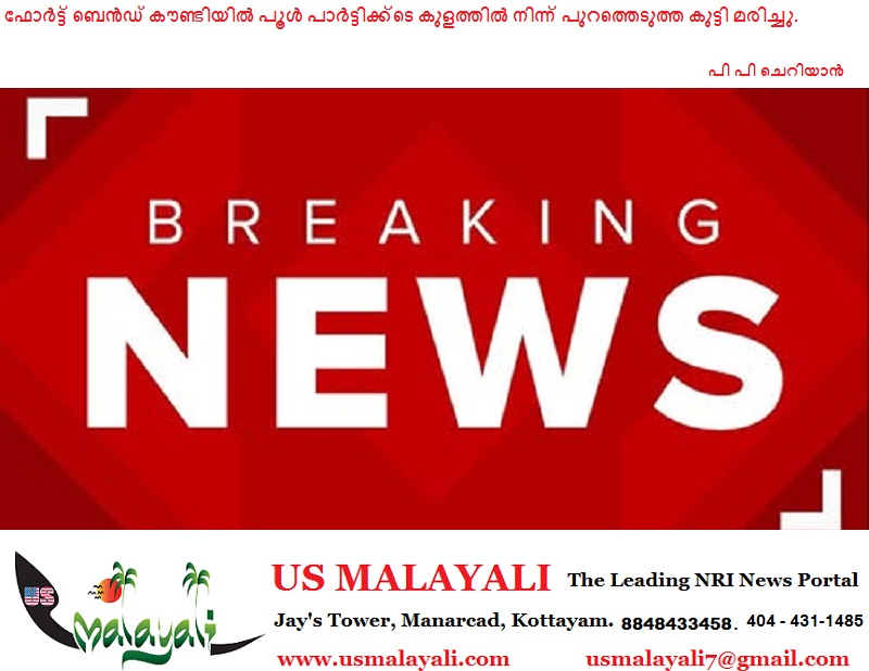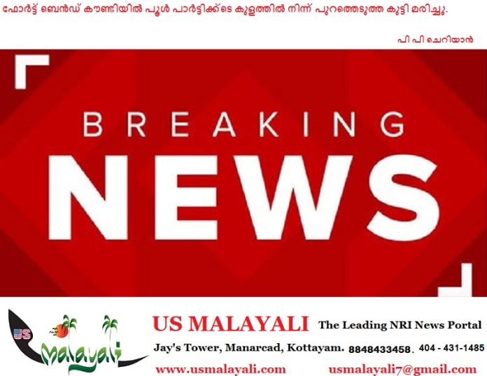 റിച്ച്മണ്ട്, ടെക്സസ്. ഫോർട്ട് ബെൻഡ് കൗണ്ടിയിലെ റിച്ചമണ്ടിൽ ഒരു പൂൾ പാർട്ടിക്ക്ടെ കുളത്തിൽ നിന്ന് പുറത്തെടുത്ത കുട്ടി മരിച്ചു. ശനിയാഴ്ചയാണ് സംഭവം നടന്നതെന്ന് ഫോർട്ട് ബെൻഡ് കൗണ്ടി ഷെരീഫ് ഓഫീസ് അറിയിച്ചു.
