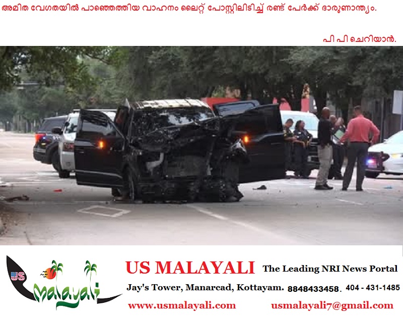 ഹൂസ്റ്റൺ: അമിത വേഗതയിൽ പാഞ്ഞെത്തിയ വാഹനം ലൈറ്റ് പോസ്റ്റിലിടിച്ച് രണ്ട് പേർ മരിച്ചു. ശനിയാഴ്ച പുലർച്ചെ മിഡ്ടൗണിലുണ്ടായ അപകടത്തിൽ, മദ്യപിച്ച് വാഹനമോടിച്ചയാൾക്കെതിരെ കൊലപാതക കുറ്റം ചുമത്തി.
