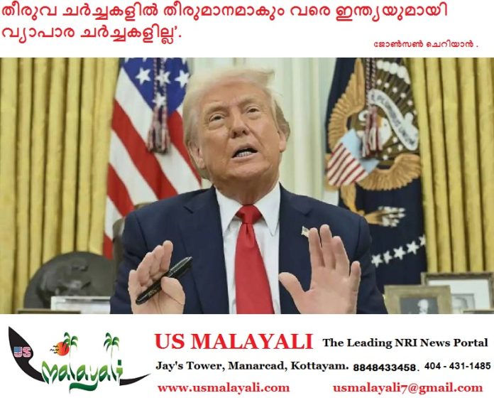 തീരുവ ചർച്ചകളിൽ തീരുമാനമാകും വരെ ഇന്ത്യയുമായി തുടർ വ്യാപാര ചർച്ചകളില്ലെന്ന് അമേരിക്കൻ പ്രസിഡന്റ് ഡോണൾഡ് ട്രംപ്. വൈറ്റ് ഹൗസിൽ മാധ്യമപ്രവർത്തകരുടെ ചോദ്യങ്ങൾക്കുള്ള മറുപടിയിലാണ് പ്രതികരണം. ഓഗസ്റ്റ് അവസാന വാരം അമേരിക്കൻ സംഘം വ്യാപാര ചർച്ചകൾക്കായി എത്താനായിരുന്നു ധാരണ.