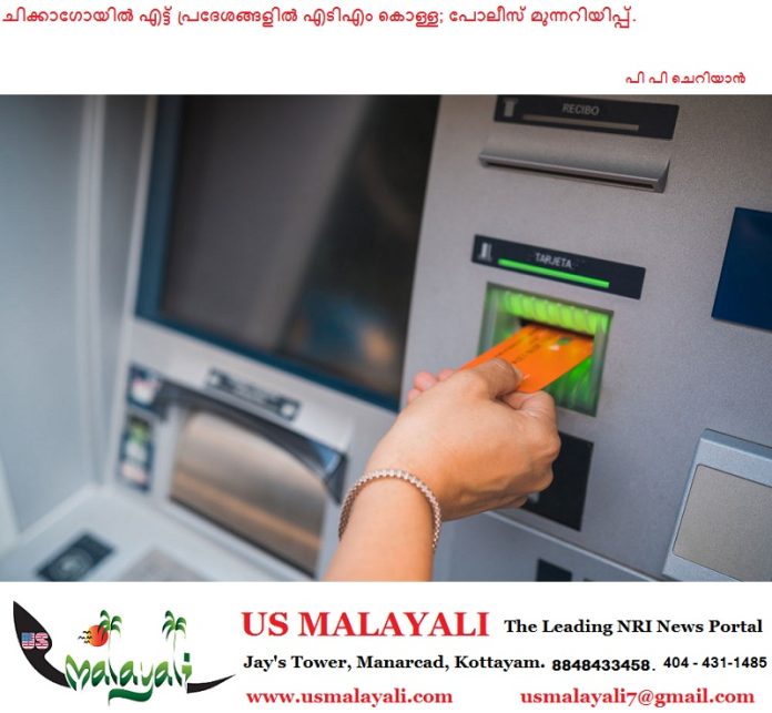 ചിക്കാഗോ: ചിക്കാഗോയിലെ എട്ട് വ്യത്യസ്ത പ്രദേശങ്ങളിൽ എടിഎമ്മുകൾ ലക്ഷ്യമിട്ട് മോഷണങ്ങൾ വർധിക്കുന്നതായി പോലീസ് മുന്നറിയിപ്പ് നൽകുന്നു. ഓഗ്ഡൻ, ഹാരിസൺ, നിയർ വെസ്റ്റ്, ഷേക്സ്പിയർ, ഓസ്റ്റിൻ, ജെഫേഴ്സൺ പാർക്ക്, നിയർ നോർത്ത്, ഗ്രാൻഡ് സെൻട്രൽ എന്നിവിടങ്ങളിലാണ് മോഷണം നടന്നത്.
