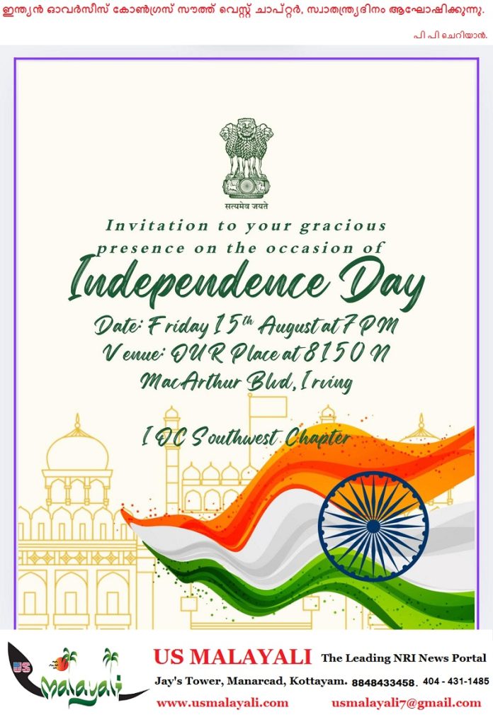 ഡാലസ്: ഇന്ത്യൻ ഓവർസീസ് കോൺഗ്രസ് സൗത്ത് വെസ്റ്റ് ചാപ്റ്റർ രാജ്യത്തിന്റെ 78-ാം സ്വാതന്ത്ര്യദിനം വിപുലമായ പരിപാടികളോടെ ആഘോഷിക്കുന്നു. ഡാലസിലെ ഇർവിംഗിലുള്ള ഔർ പ്ലേസ് ഇന്ത്യൻ റെസ്റ്റോറന്റിൽ ഓഗസ്റ്റ് 15 വെള്ളിയാഴ്ച വൈകുന്നേരം 7 മണിക്കാണ് ആഘോഷ പരിപാടികൾ ക്രമീകരിച്ചിരിക്കുന്നത്.