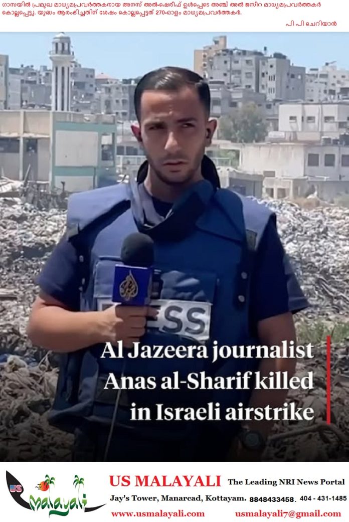 ഗാസയിലെ അൽ-ഷിഫ ആശുപത്രിക്ക് പുറത്ത് മാധ്യമപ്രവർത്തകർക്കായി ഒരുക്കിയ കൂടാരത്തിന് നേരെ ഇസ്രയേൽ നടത്തിയ ഡ്രോൺ ആക്രമണത്തിലാണ് അഞ്ച് അൽ ജസീറ ജീവനക്കാർ അടക്കം ഏഴ് പേർ കൊല്ലപ്പെട്ടത്.കൊല്ലപ്പെട്ടവരി