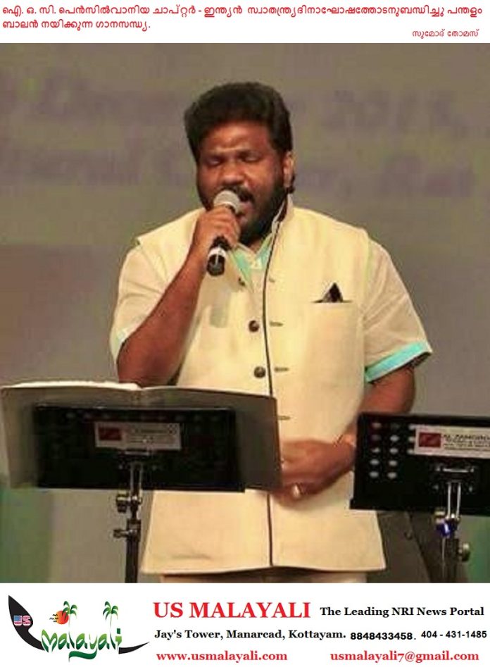 ഫിലാഡൽഫിയ: ഇന്ത്യൻ ഓവർസീസ് കോൺഗ്രസ് കേരള ചാപ്റ്റർ പെൻസിൽവാനിയ ഘടകം നടത്തുന്ന 79-ാമത് ഇന്ത്യൻ സ്വാതന്ത്ര്യദിനാഘോഷങ്ങളിൽ പ്രശസ്ത സിനിമ പിന്നണി ഗായകർ പന്തളം ബാലൻ അവതരിപ്പിക്കുന്ന ഗാനസന്ധ്യ അരങ്ങേറും.