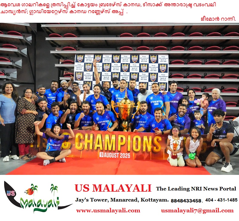 ഹൂസ്റ്റണ്: ആവേശത്തിമിര്പ്പിന്റെ പോര്ക്കളത്തില് കാരിരുമ്പിന്റെ കരുത്തുമായി കാലുറപ്പിച്ച് കമ്പക്കയറില് സിംഹഗര്ജനത്തോടെ ആഞ്ഞുവലിച്ച് ആയിരങ്ങളുടെ ആവേശമായിമാറിയ കോട്ടയം ബ്രദേഴ്സ് കാനഡ ബ്ലൂ, ടെക്സസ് ഇന്റര്നാഷണല് സ്പോര്ട്സ് ആന്റ് ആര്ട്സ് ക്ലബ്ബിന്റെ (ടിസാക്ക്) അന്താരാഷ്ട്ര വടംവലി മത്സരത്തില് ചാമ്പ്യന്മാരായി. മെയ്ക്കരുത്തും മനക്കരുത്തും സ്വന്തമാക്കിയ ഗ്ലാഡിയേറ്റേഴ്സ് കാനഡ റണ്ണറപ്പായി ട്രോഫി ഉയര്ത്തി. കായികശേഷി പരീക്ഷിച്ച് ഗാലക്സി ഡബ്ളിന് അയര്ലന്ഡ് മൂന്നാം സ്ഥാനക്കാരുടെ കപ്പെടുത്തു. ന്യൂയോര്ക്ക് കിങ്സാണ് നാലാം സ്ഥാനത്തെത്തിയ ത്.