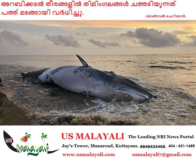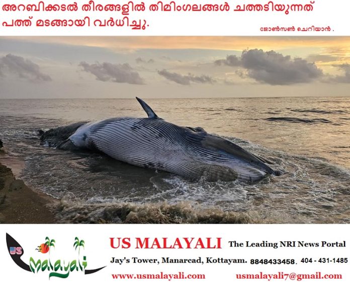 അറബിക്കടല് തീരങ്ങളില് തിമിംഗലങ്ങള് ചത്ത് അടിയുന്നത് കഴിഞ്ഞ ഒരു ദശകത്തിനുള്ളില് പത്ത് മടങ്ങ് വര്ധിച്ചതായി കണ്ടെത്തല്. കേന്ദ്ര സമുദ്രമത്സ്യ ഗവേഷണ സ്ഥാപനം നടത്തിയ (സിഎംഎഫ്ആര്ഐ) പഠനത്തില് 2004-2013 കാലയളവില് പ്രതിവര്ഷം 0.3 ശതമാനമായിരുന്നത് 2013-2023 കാലയളവില് പ്രതിവര്ഷം 3 ശതമാനമായി കുത്തനെ കൂടിയെന്ന് കണ്ടെത്തി.