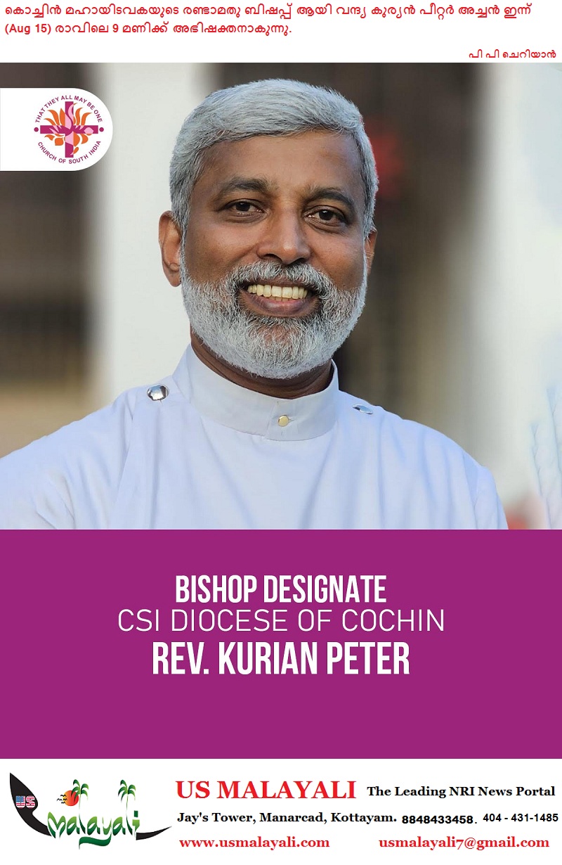 എറണാകുളം:കൊച്ചിൻ മഹായിടവകയുടെ രണ്ടാമതു ബിഷപ്പ് ആയി വന്ദ്യ കുര്യൻ പീറ്റർ അച്ചൻ ഇന്ന് വെള്ളിയാഴ്ച (Aug 15) രാവിലെ 9 മണിക്ക് അഭിഷക്തനാകുന്നു. കൊച്ചിൻ മഹായിടവക രൂപീകൃതമായതിനു ശേഷം നടത്തപെടുന്ന ആദ്യത്തെ കോൺസിക്രേഷനാണ്.
