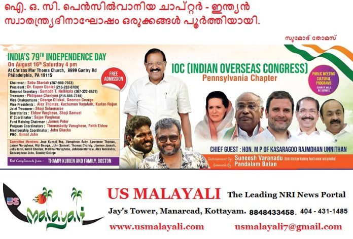 ഫിലാഡൽഫിയ: ഇന്ത്യൻ ഓവർസീസ് കോൺഗ്രസ് കേരള ചാപ്റ്റർ പെൻസിൽവാനിയ ഘടകം നടത്തുന്ന 79 -ാമത് ഇന്ത്യൻ സ്വാതന്ത്ര്യദിനാഘോഷങ്ങൾക്കുള്ള ഒരുക്കം പൂർത്തിയായതായി സംഘാടക സമിതി അറിയിച്ചു. ഓഗസ്റ്റ് 16 ശനിയാഴ്ച വൈകിട്ട് 4 .00 മണി (EST)ക്ക് ഫിലാഡൽഫിയയിലെ ക്രിസ്റ്റോസ് ചർച്ച് ഓഡിറ്റോറിയത്തിൽ (9999 Gantry Rd, Philadelphia, PA 19115) വച്ചാണ് ആഘോഷ പരിപാടികൾ അരങ്ങേറുക.