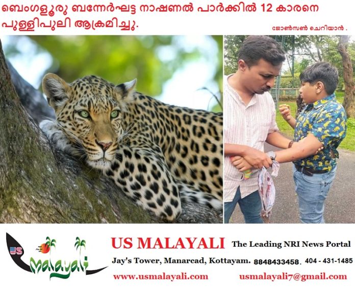 ബെംഗളൂരു ബന്നേർഘട്ട നാഷണൽ പാർക്കിൽ (ബിഎൻപി) ജീപ്പ് സഫാരിക്കിടെ പന്ത്രണ്ടുകാരന് പുള്ളി പുലിയുടെ ആക്രമണം. പുലിയുടെ നഖം കൊണ്ട് കുട്ടിയുടെ കൈയ്ക്ക് പരുക്കേറ്റു. സഫാരി ജീപ്പിൽ പാർക്ക് ചുറ്റികാണുമ്പോഴായിരുന്നു സംഭവം. ജീപ്പ് പിന്തുടർന്ന് എത്തിയ പുലി വാഹനത്തിന്റെ സൈഡ് ഗ്ലാസിന് വെച്ചിരുന്ന കുട്ടിയുടെ കൈയ്യിലേക്ക് നഖം കൊണ്ട് പോറൽ ഏൽപ്പിക്കുകയായിരുന്നു.