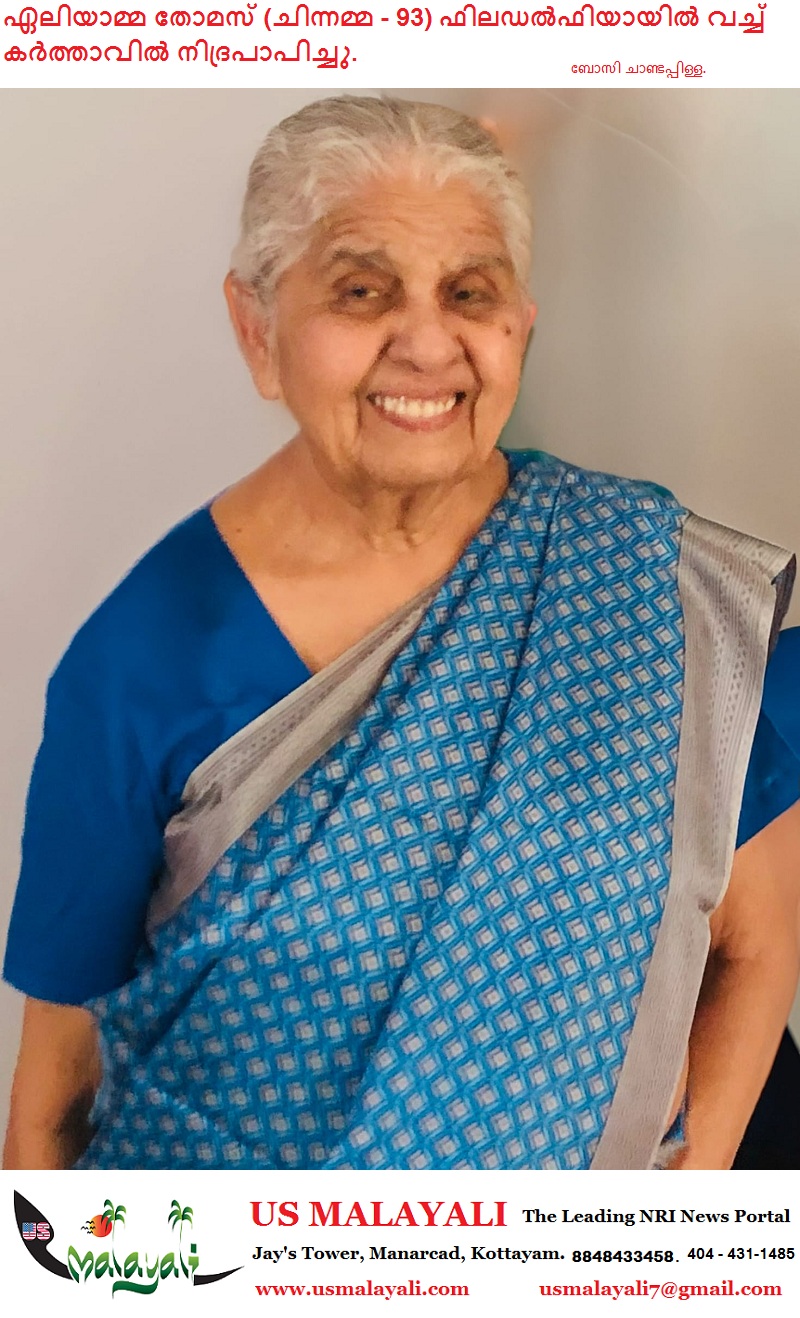 ഫിലഡൽഫിയാ: കീഴ്വായ്പ്പൂർ താഴത്തേടത്ത് പരേതരായ സി.വി. വറുഗീസിന്റെയും സോസമ്മ വറുഗീസിന്റെയും മകളും, കീഴ്വായ്പ്പൂർ കരോട്ട് ബഥേലിൽ പരേതനായ കുര്യൻ തോമസിന്റെ ഭാര്യ- ഏലിയാമ്മ തോമസ് (ചിന്നമ്മ – 93) ഫിലഡൽഫിയായിൽ വച്ച് കർത്താവിൽ നിദ്രപാപിച്ചു.