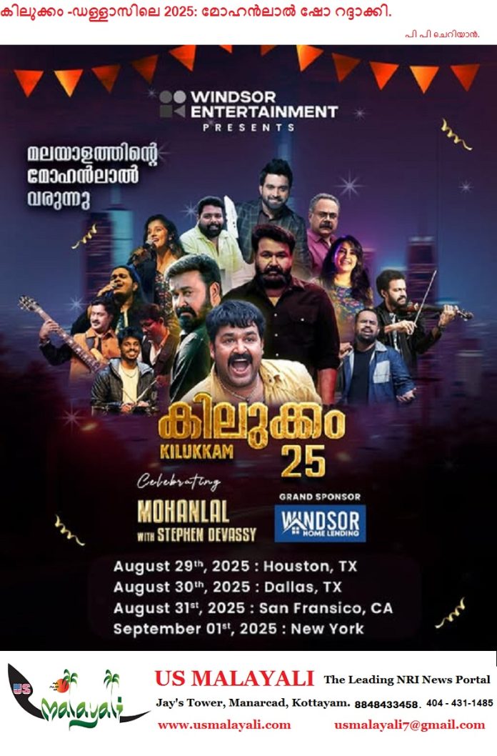 ഡാളസ്: 2025 ഓഗസ്റ്റ് 30-ന് ഡാളസിൽ വെച്ച് നടക്കാനിരുന്ന ‘കിലുക്കം – 2025’ എന്ന മോഹൻലാൽ ഷോ അപ്രതീക്ഷിതമായി റദ്ദാക്കിയതായി ഗാലക്സി എൻ്റർടൈൻമെൻ്റ് അറിയിച്ചു. മോഹൻലാലിൻ്റെ ടീമിലെ ഏതാനും അംഗങ്ങൾക്ക് വിസ സംബന്ധമായ പ്രശ്നങ്ങൾ നേരിട്ടതാണ് ഷോ റദ്ദാക്കാൻ കാരണം.
