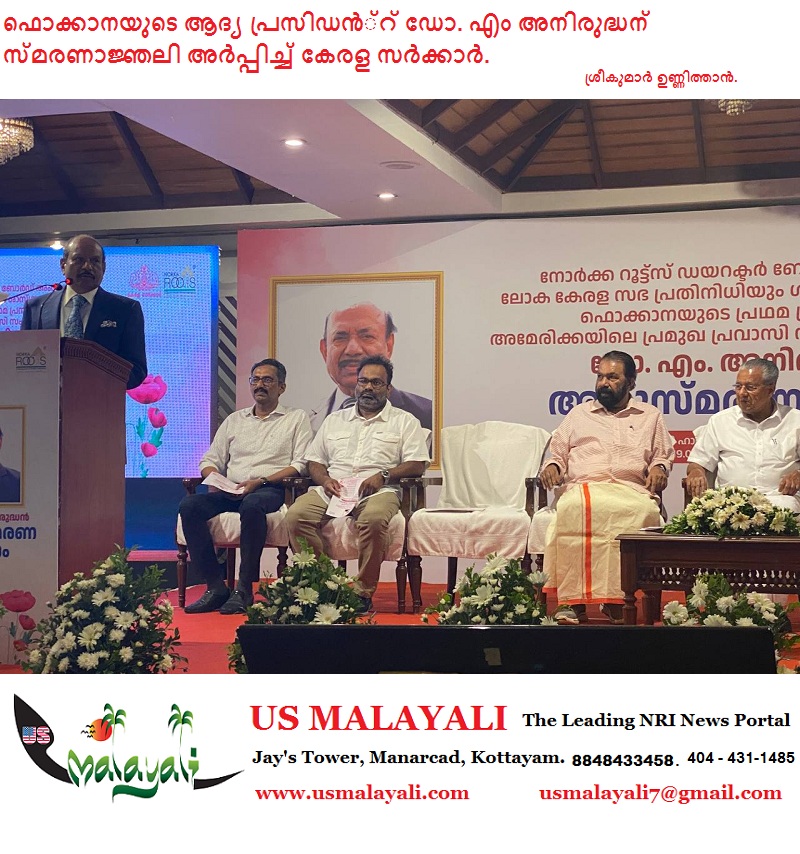 ഫൊക്കാനയുടെ ആദ്യ പ്രസിഡൻ്റ് ഡോ. എം അനിരുദ്ധന് സ്മരണാജ്ഞലി അർപ്പിച്ച് കേരള സർക്കാർ ഒരു പ്രത്യേക അനുസ്മരണ യോഗം തിരുവനന്തപുരം മാസ്കറ്റ് ഹോട്ടലിൽ നടത്തി . ഫൊക്കാന നേതാക്കൾ കേരളത്തിൽ ഉള്ളപ്പോൾ തന്നെ ഈ അനുസ്മരണ യോഗം കേരള സർക്കാർ പ്ലാൻ ചെയ്തതായിരുന്നു , പക്ഷേ മുൻ മുഖ്യമന്ത്രി വി എസ് അച്യുതാനന്ദന്റെ നിര്യാണം മൂലം ഈ അനുസ്മരണം മാറ്റിവെക്കുകയാണ് അന്ന് ഉണ്ടായത് .നോർക്ക റൂട്ട്സ് ഡയറക്ടർ കൂടി ആയിരുന്ന അദ്ദേഹത്തെ ഓർമ്മിക്കാൻ മുഖ്യമന്ത്രി പ്രത്യേക താല്പര്യം പ്രകടിപ്പിച്ച് നടത്തിയ അനുസ്മരണ സമ്മേളനം ആയിരുന്നു മുഖ്യമന്ത്രി പിണറായി വിജയൻ മന്ത്രി വി ശിവൻകുട്ടി , മുൻ മന്ത്രിമാരായ എം. എം. ഹസൻ , കെ. സി. ജോസഫ് , എം. എ യൂസഫലി , നോർക്ക വൈസ് ചെയർമാൻ പി. ശ്രീരാമ കൃഷ്ണൻ , എസ് ഹരി കിഷോർ IAS , ഡോ. അനിരുദ്ധൻ്റെ മകൻ അരുൺ, അജിത്ത് കോളശ്ശേരിയും പ്രവാസി നേതാക്കളും, ഫൊക്കാന നേതാക്കളും , മാധ്യമ പ്രവർത്തകരും പങ്കെടുത്തു.