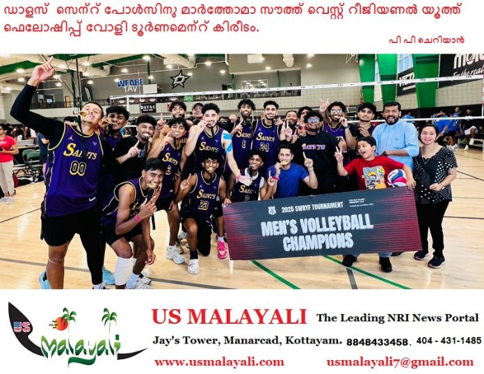 ഡാളസ് : 2025-ലെ മാർത്തോമാ സൗത്ത് വെസ്റ്റ് റീജിയണൽ യൂത്ത് ഫെലോഷിപ്പ് പുരുഷന്മാരുടെ വോളിബോൾ ടൂർണമെന്റിൽ ഡാളസ്സിലെ സെന്റ് പോൾസ് മാർത്തോമ പള്ളിക്ക് വിജയം.ഈ വർഷം കളിച്ച എല്ലാ മത്സരങ്ങളിലും വിജയിച്ച് അജയ്യരായി നിലകൊണ്ട ഡാളസ് .സെന്റ് പോൾസ് ഫൈനലിൽ ഹൂസ്റ്റണിലെ ഇമ്മാനുവൽ മാർത്തോമ പള്ളിയിൽ നിന്നുള്ള മറ്റൊരു യുവ ടീമിനെ ആവേശകരമായ പോരാട്ടത്തിൽ പരാജയപ്പെടുത്തിയാണ് കിരീടം നേടിയത്.