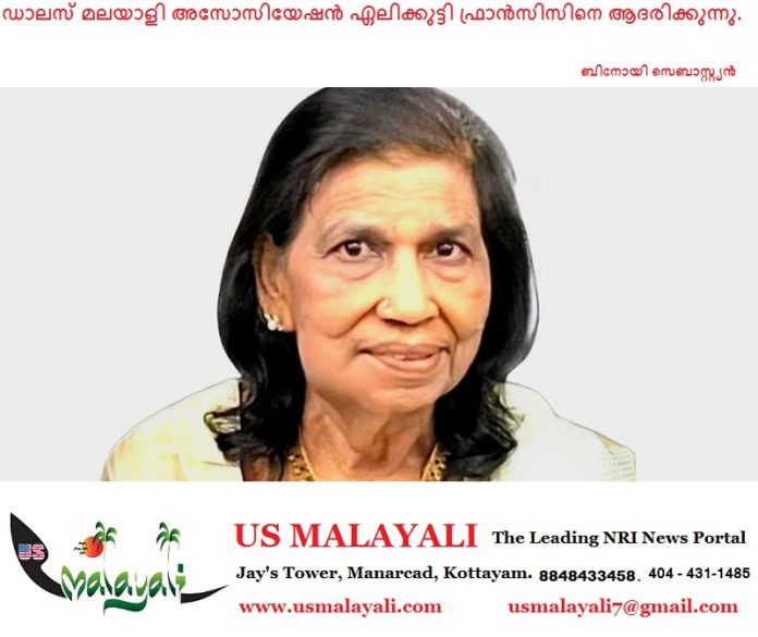 ഡാലസ്∙ ടെക്സസിലെ ആദ്യകാല മലയാളിയും ഇന്ത്യൻ അമേരിക്കൻ നഴ്സസ് അസോസിയേഷന്റെ സ്ഥാപക നേതാവുമായ ഏലിക്കുട്ടി ഫ്രാൻസിസിനെ ഡാലസ് മലയാളി അസോസിയേഷൻ ആദരിക്കുന്നു. കൊപ്പേൽ സെന്റ് അൽഫോൺസാ ചർച്ച് ഓഡിറ്റോറിയത്തിൽ 30ന് രാവിലെ 10.30ന് നടക്കുന്ന ഓണാഘോഷ ചടങ്ങിൽ ഏലിക്കുട്ടി ഫ്രാൻസിസിനെ പൊന്നാടയണിയിക്കുകയും ഫലകം നൽകി ആദരിക്കുകയും ചെയ്യും.