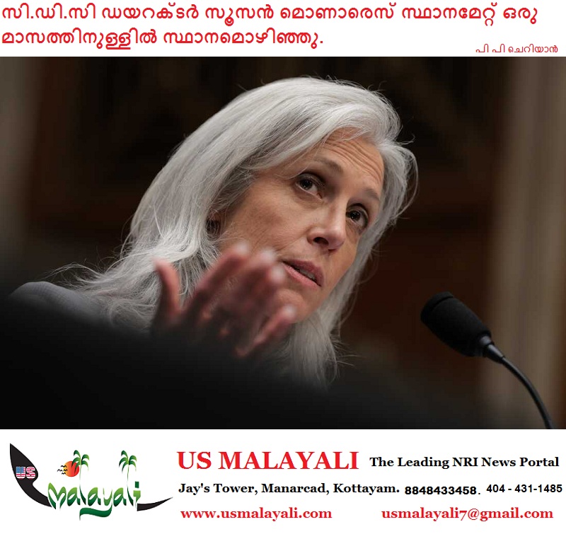 ന്യൂയോർക്ക് (എ.പി.) – അമേരിക്കയിലെ ഉന്നത പൊതുജനാരോഗ്യ ഏജൻസിയായ സെന്റർസ് ഫോർ ഡിസീസ് കൺട്രോൾ ആൻഡ് പ്രിവൻഷൻ്റെ (സി.ഡി.സി) ഡയറക്ടർ സൂസൻ മൊണാരെസ് സ്ഥാനമൊഴിഞ്ഞു. സ്ഥാനമേറ്റ് ഒരു മാസത്തിനുള്ളിലാണ് ഈ അപ്രതീക്ഷിത രാജി. ഇവരെ കൂടാതെ സി.ഡി.സിയിലെ മറ്റ് പ്രമുഖരും രാജിവെച്ചിട്ടുണ്ട്.