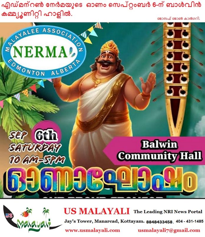 എഡ്മന്റൺ: ഐശ്വര്യത്തിന്റെയും സമൃദ്ധിയുടെയും പ്രതീകമായ ഓണത്തെ വരവേൽക്കാൻ എഡ്മന്റൺ നഗരം ഒരുങ്ങി. 2025 സെപ്റ്റംബർ 6-ന്, ശനിയാഴ്ച, രാവിലെ 10:45-ന് ബാൾവിൻ കമ്മ്യൂണിറ്റി ഹാളിൽ വെച്ച് നടക്കുന്ന ഓണാഘോഷത്തിൽ മഹാബലി തമ്പുരാനെ വരവേൽക്കാൻ വിപുലമായ പരിപാടികളാണ് നേർമ സംഘാടകർ ഒരുക്കിയിരിക്കുന്നത്. എഡ്മന്റണിലെ മലയാളി സമൂഹത്തിന്റെ കൂട്ടായ്മയും സാംസ്കാരിക പൈതൃകവും വിളിച്ചോതുന്ന ഈ ഓണാഘോഷം പഴമയുടെയും പുതുമയുടെയും സമ്മേളനമാകും.