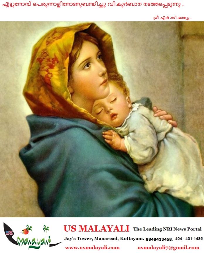 പരി .സുറിയാനി സഭയിൽ ജനനപെരുന്നാളോഘോഷിക്കാൻ അപൂർവ്വ ഭാഗ്യം ലഭിച്ച ശുദ്ധിമതിയായ ദൈവമാതാവിൻറെ ജനനപെരുന്നാളിനോടനുബന്ധിച്ചു മലങ്കരയിൽ പ്രാദേശികമായി പ്രചാരത്തിലിരിക്കുന്ന എട്ടുനോമ്പുപെരുന്നാളും വി.കുർബാനയും, സുറിയാനിസഭയ്ക്കു ലഭിച്ച അമൂല്യ തിരുശേഷിപ്പായ പരി .ദൈവമാതാവിൻറെ ഇടക്കെട്ടിൻ്റെ (സൂനോറോ )അംശം സ്ഥാപിതമായിരിക്കുന്ന ജാക്സൺ വില്ല് മദർ ഓഫ് ഗോഡ് ഓഫ് സൂനോറോ സിറിയക് ഓർത്തഡോൿസ് പള്ളിയിൽ വെച്ച് സെപ് 6 ന് ശനിയാഴ്ച രാവിലെ 9.30 ന് നടത്തപ്പെടുന്നു . വി.കുർബാനയെ തുടർന്ന് വി .മാതാവിനോടുള്ള മധ്യസ്ഥപ്രാർത്ഥന ,ധൂപപ്രാർത്ഥന, കൈമുത്തു ,നേർച്ചവിളമ്പു എന്നിവ ഉണ്ടായിരിക്കും . വി.കുർബാനയ്ക്കും പെരുന്നാൾ ശുശ്രൂഷകൾക്കും റവ .ഫാ .ടോംസൺ ചാക്കോ നേതൃത്വം നൽകുന്നതായിരിക്കും