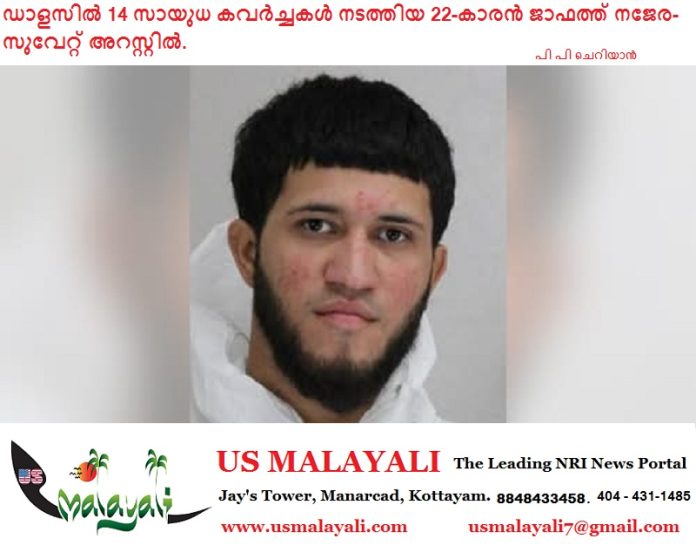 ഡാളസ്: ഈ വർഷം ഡാളസ് നഗരത്തിൽ 14 കവർച്ചകൾ നടത്തിയ കേസിൽ 22 വയസ്സുകാരനായ ജാഫത്ത് നജേര-സുവേറ്റ് അറസ്റ്റിലായി. ഡാളസ് പോലീസ് സീരിയൽ റോബറി ടാസ്ക് ഫോഴ്സാണ് ഇയാളെ പിടികൂടിയത്.