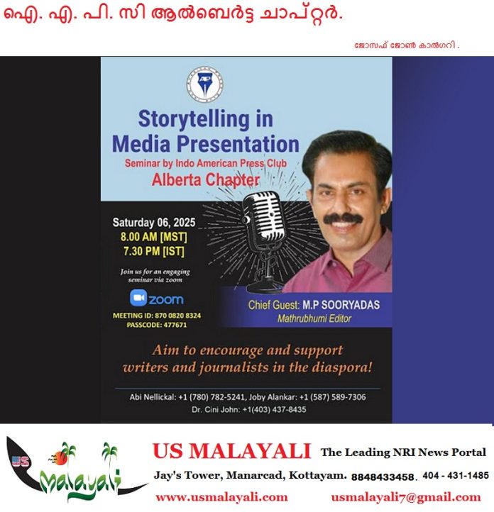 കാൽഗറി : ഇൻഡോ അമേരിക്കൻ പ്രെസ്സ് ക്ലബ് ആൽബെർട്ട ചാപ്റ്ററിന്റെ നേതൃത്വത്തിൽ സെമിനാർ “കഥ പറച്ചിൽ ” സെപ്തംബർ 6 , ശനിയാഴ്ച്ച രാവിലെ 8 .00 (M S T) ന് സൂമിൽ സംഘടിപ്പിക്കുന്നു. പ്രമുഖ പത്രപ്രവർത്തകനും , മാതൃഭൂമി എഡിറ്ററുമായ എം.പി സൂര്യദാസ് മുഖ്യാതിഥി ആയിരിക്കും . പങ്കെടുക്കാൻ താത്പ്പര്യപ്പടുന്നവർ www.indoamericanpressclub.com/