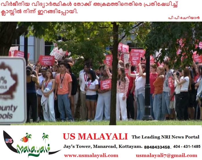 വിർജീനിയ:അമേരിക്കയിൽ തോക്ക് ഉപയോഗിച്ചുള്ള അക്രമങ്ങൾ വർധിക്കുന്നതിൽ പ്രതിഷേധിച്ച് വിർജീനിയയിലെ നൂറുകണക്കിന് വിദ്യാർഥികൾ ക്ലാസ് മുറികളിൽ നിന്ന് ഇറങ്ങിപ്പോയി. സ്കൂളുകളിലെ തോക്ക് അക്രമങ്ങൾക്ക് എതിരെ രാജ്യവ്യാപകമായി നടക്കുന്ന ഈ പ്രതിഷേധത്തിൽ വിദ്യാർഥികൾ അണിചേർന്നു.