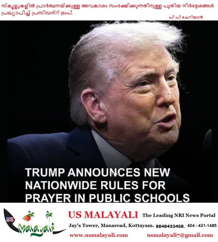 ന്യൂയോർക്:പൊതുവിദ്യാലയങ്ങളിൽ പ്രാർത്ഥിക്കാനുള്ള വിദ്യാർത്ഥികളുടെ അവകാശം സംരക്ഷിക്കുന്നതിനായി വിദ്യാഭ്യാസ വകുപ്പ് പുതിയ മാർഗ്ഗനിർദ്ദേശങ്ങൾ പുറത്തിറക്കുമെന്ന് പ്രസിഡന്റ് ട്രംപ് അറിയിച്ചു. മ്യൂസിയം ഓഫ് ദി ബൈബിളിൽ നടന്ന ‘മതസ്വാതന്ത്ര്യ കമ്മീഷൻ’ യോഗത്തിൽ സംസാരിക്കുകയായിരുന്നു അദ്ദേഹം. “ഒരു വലിയ രാഷ്ട്രത്തിന് മതം ആവശ്യമാണ്” എന്ന് ട്രംപ് പറഞ്ഞു.