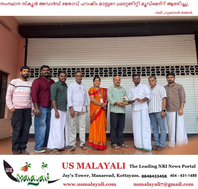 ഫോട്ടോ കാപ്ഷൻ: 2025 ലെ സംസ്ഥാന അധ്യാപക അവാർഡ് ജേതാവ് മലപ്പുറം എ.യു.പി സ്കൂളിലെ കെ.വി.സയ്യിദ് ഹാഷിം മാസ്റ്റർക്ക് ഫ്രറ്റേണിറ്റി മലപ്പുറം ജില്ലാ കമ്മിറ്റിയുടെ ആദരം ജില്ലാ പ്രസിഡന്റ് വി.ടി.എസ് ഉമർ തങ്ങൾ കൈമാറുന്നു.