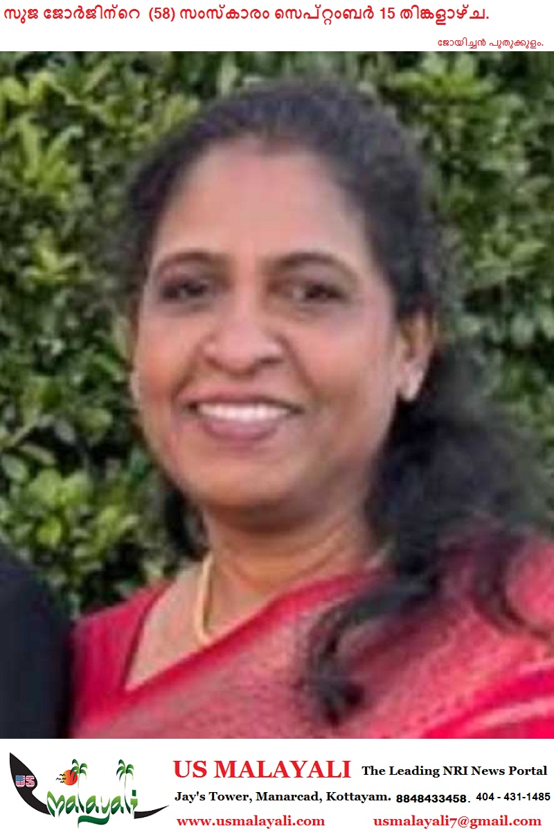 ന്യു ജേഴ്സി: ന്യു ജേഴ്സിയിൽ അന്തരിച്ച മെർക്ക് ഫാർമസ്യുട്ടിക്കൽസ് അസോസിയേറ്റ് ഡയറക്ടർ സുജ ജോർജിന്റെ (58) സംസ്കാരം സെപ്റ്റംബർ 15 തിങ്കളാഴ്ച റാൻഡോൾഫിലെ മാർത്തോമ ചർച്ച് ഓഫ് ന്യൂജേഴ്സിയിലെ ശുശ്രുഷകൾക്കു ശേഷം നടത്തും.
