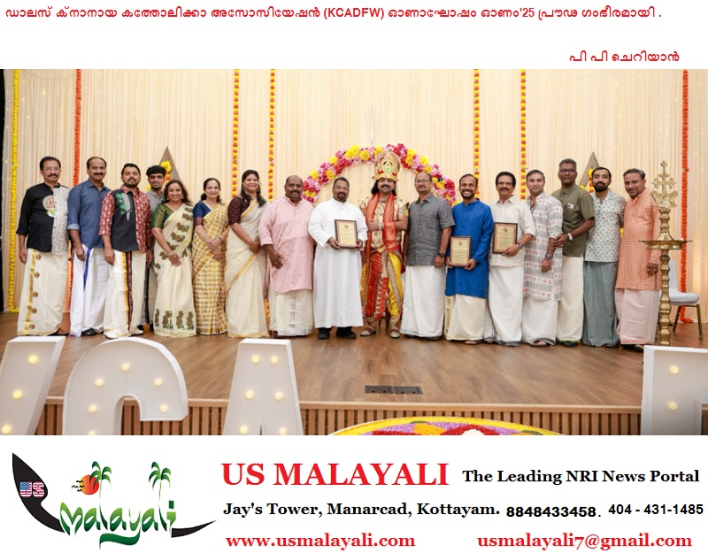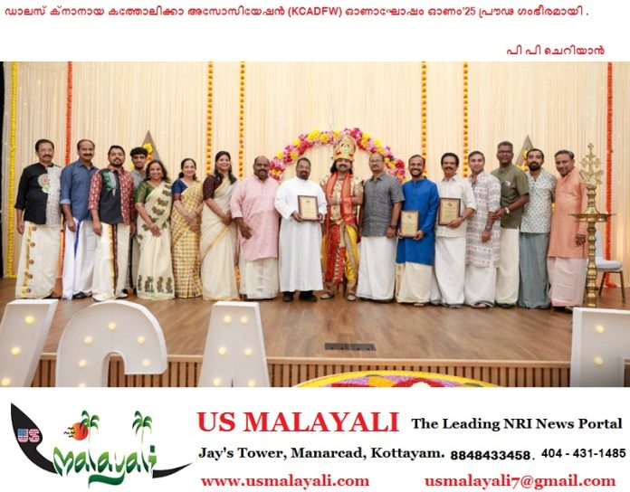 ഡാലസ്: ക്നാനായാ കത്തോലിക്കാ അസോസിയേഷൻ ഓഫ് ഡാലസ്–ഫോർത്ത്വർത്ത് (KCADFW) ഓണം’ 2025 കേരളീയ സാംസ്കാരിക മികവവോടെ ഗംഭീരമായി ആഘോഷിച്ചു. ക്രൈസ്റ്റ് ദി കിംഗ് ക്നാനായ കത്തോലിക്കാ ദേവാലയത്തിലെ ക്നായ് തോമ്മൻ ഹാളിൽ നടന്ന ചടങ്ങ് വൈകിട്ട് 6:30ന് മഹാബലിയുടെയും താലപ്പൊലിയേന്തിയ മഹിളാമണികളുടയും ചെണ്ടമേളവും ചുണ്ടൻ വള്ളവും അണിനിരത്തിയ സാംസ്കാരിക ഘോഷയാത്രയോടെ വിശിടാതിഥികളെ വരവേറ്റു .