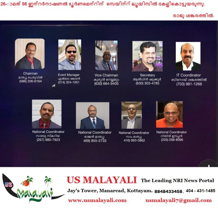 സെയിന്റ് ലൂയിസ് : സെപ്റ്റംബർ 19, 20, 21 (വെള്ളി ശനി ഞായർ) തീയതികളിൽ സെയിന്റ് ലൂയിസിൽ വെച്ചു (727 Weidman Rd, Manchester, MO) നടത്തപ്പെടുന്ന, 26-ാമത് 56 ഇന്റർനാഷണലിന്റെയും, സെന്റ് ലൂയിസ് 56 ക്ലബ്ബിന്റെയും സംയുക്താഭിമുഖ്യത്തിൽ നടത്തപ്പെടുന്ന ടൂർണമെന്റിന്റെ ഒരുക്കങ്ങൾ പൂർത്തിയായിക്കൊണ്ടിരിക്കുന്നതാ