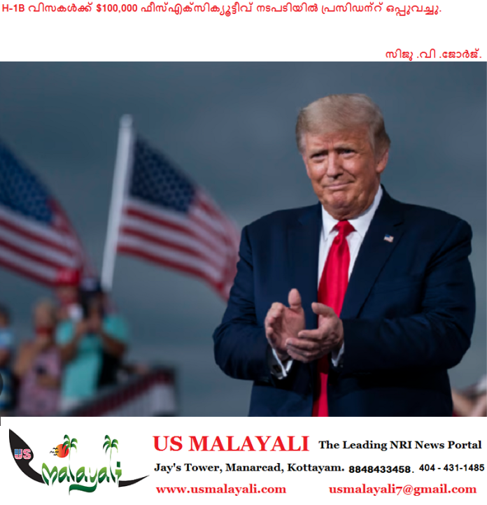 വാഷിംങ്ടൺ : പ്രോഗ്രാമിന്റെ അമിത ഉപയോഗം തടയുന്നതിനായി, H-1B വിസകൾക്ക് $100,000 അപേക്ഷാ ഫീസ് ചുമത്തുന്നതിനുള്ള എക്സിക്യൂട്ടീവ് നടപടിയിൽ പ്രസിഡന്റ് ഡൊണാൾഡ് ട്രംപ് വെള്ളിയാഴ്ച ഒപ്പുവച്ചു.