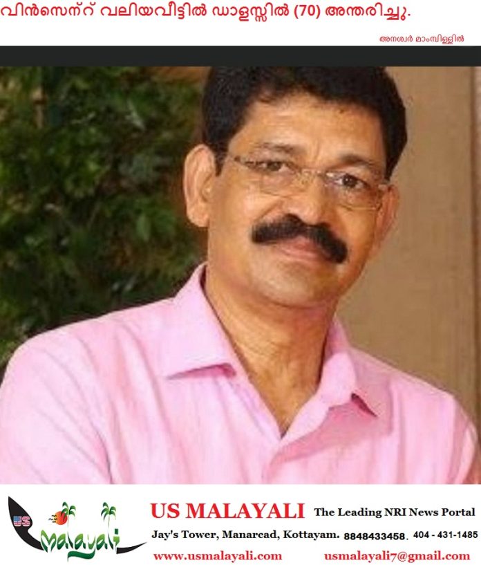 ഡാളസ് : വിൻസെന്റ് വലിയവീട്ടിൽ ഡാളസ്സിൽ അന്തരിച്ചു.തൃശൂർ ഒല്ലൂർ സ്വദേശിയായിരുന്നു.