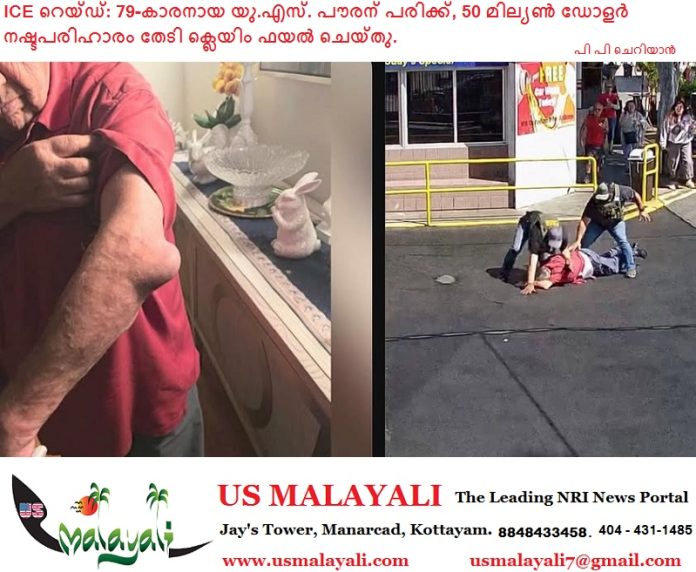 ലോസ് ആഞ്ചലസ്: യു.എസ്. പൗരനായ 79-കാരനെ ഐസ് (ഇമിഗ്രേഷൻ ആൻഡ് കസ്റ്റംസ് എൻഫോഴ്സ്മെന്റ്) ഏജന്റുമാർ തന്റെ ബിസിനസ് സ്ഥാപനത്തിൽ വെച്ച് തറയിലേക്ക് ബലമായി തള്ളിയിട്ട് പരിക്കേൽപ്പിച്ചു എന്ന് പരാതി. ഇതിനെ തുടർന്ന് ഇദ്ദേഹം ഫെഡറൽ ഏജൻസികളിൽ നിന്ന് 50 മില്യൺ ഡോളർ (ഏകദേശം $417 കോടിയിലധികം രൂപ) നഷ്ടപരിഹാരം തേടി അഡ്മിനിസ്ട്രേറ്റീവ് ക്ലെയിം ഫയൽ ചെയ്തു.