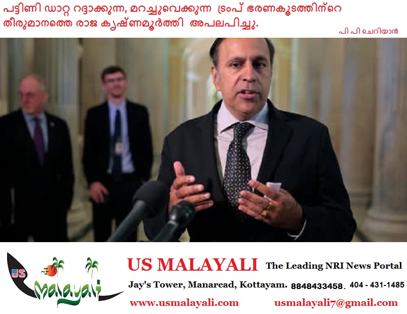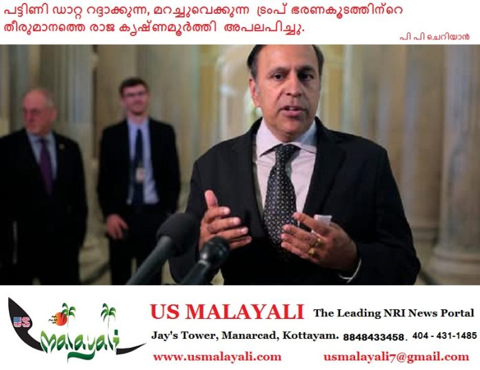 ഷാമ്പ്ബർഗ്(ഇല്ലിനോയ് ): അമേരിക്കയിലെ പട്ടിണി ട്രാക്കുചെയ്യുന്നതിനുള്ള നിർണായക USDA യുടെ ഗാർഹിക ഭക്ഷ്യസുരക്ഷാ റിപ്പോർട്ട് റദ്ദാക്കാനുള്ള ട്രംപ് ഭരണകൂടത്തിന്റെ തീരുമാനത്തെ കോൺഗ്രസുകാരനായ രാജ കൃഷ്ണമൂർത്തി അപലപിച്ചു.