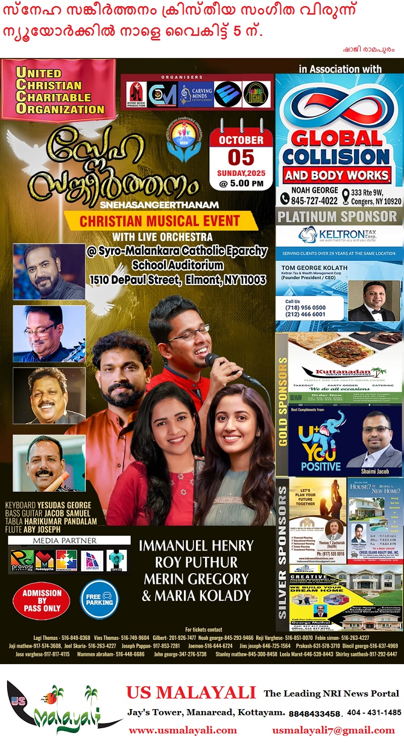 ന്യൂയോർക്ക്: യുണൈറ്റഡ് ക്രിസ്ത്യൻ ചാരിറ്റബിൾ ഓർഗനൈസേഷന്റെ നേതൃത്വത്തിൽ മലയാളത്തിലെ സുപ്രസിദ്ധ ഗായകരായ ഇമ്മാനുവേൽ ഹെൻറി, റോയ് പുത്തൂർ, മെറിൻ ഗ്രിഗറി, മരിയ കോലാടി എന്നിവർ നയിക്കുന്ന സ്നേഹ സങ്കീർത്തനം എന്ന ക്രിസ്തിയ സംഗീത വിരുന്ന് ഒക്ടോബർ 5 ഞായറാഴ്ച (നാളെ) വൈകിട്ട് 5 മണിക്ക് ന്യൂയോർക്ക് എൽമോന്റ് സീറോ മലങ്കര കാത്തലിക് സ്കൂൾ ഓഡിറ്റോറിയത്തിൽ വെച്ച് (1510, DePaul Street, Elmont, NY 11003) നടത്തപ്പെടുന്നു.