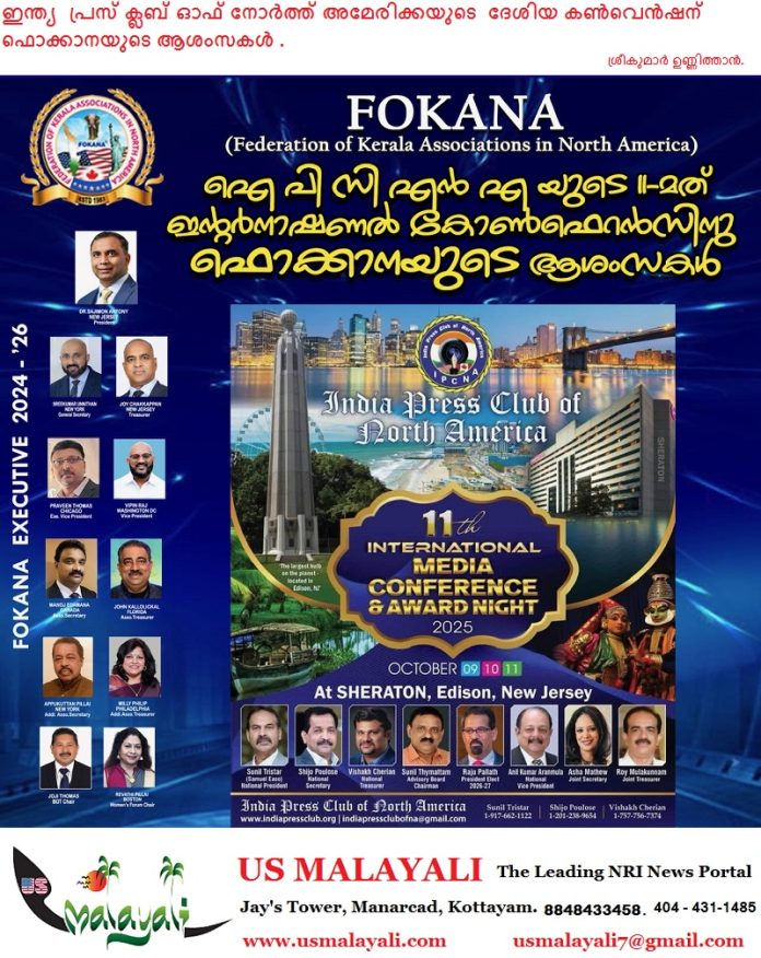 ന്യൂ യോർക്ക്: ഇന്ത്യ പ്രസ് ക്ലബ് ഓഫ് നോർത്ത് അമേരിക്കയുടെ (ഐ പി സി എൻ എ) ദേശിയ കൺവെൻഷൻ ഒക്ടോബർ 9, 10, 11 തീയതികളിൽ ന്യൂ ജേഴ്സിയിലെ എഡിസണിലുള്ള പ്രസിദ്ധമായ ഷെറാട്ടൺ ഹോട്ടലിൽ വെച്ച് നടത്തുബോൾ അത് മാധ്യമ ലോകത്ത് തന്നെ ഒരു നവ്യാനുഭവം സൃഷ്ടിക്കുകയാണ്. ഐ പി സി എൻ എ ദേശിയ കൺവെൻഷന് ഫൊക്കാനയുടെ സ്നേഹ ആശംസകൾ നേരുന്നതായി പ്രസിഡന്റ് സജിമോൻ ആന്റണി അറിയിച്ചു.