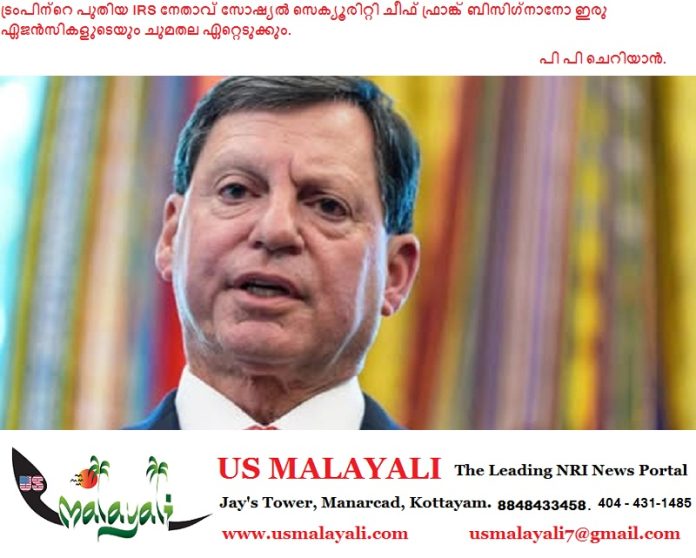 വാഷിംഗ്ടൺ: യു.എസ്. പ്രസിഡന്റ് ഡോണൾഡ് ട്രംപ് ആഭ്യന്തര വരുമാന സേവന ഏജൻസിയായ IRS-ിന്റെ നേതൃത്വത്തിൽ പുതിയതായൊരു തീരുമാനമെടുത്തു. സോഷ്യൽ സെക്യൂരിറ്റി അഡ്മിനിസ്ട്രേറ്റർ ഫ്രാങ്ക് ബിസിഗ്നാനോയെ IRS-ിന്റെ *”ചീഫ് എക്സിക്യുട്ടീവ് ഓഫീസർ”* എന്ന പദവിയിലേക്ക് നിയമിച്ചിട്ടുണ്ട്. ഇത് IRS-ിൽ നിലവിലില്ലാത്ത പദവിയാണ്.