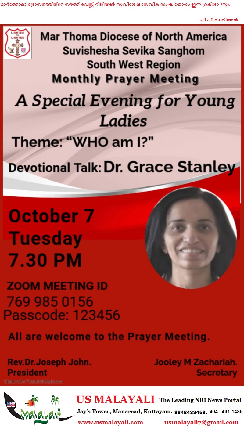 ഡാളസ്:നോർത്ത് അമേരിക്ക മാർത്തോമാ ഭദ്രാസന സൗത്ത് വെസ്റ്റ് റീജിയൻ സുവിശേഷ സേവിക സംഘം, യുവതികൾക്കായി പ്രത്യേക നടത്തപ്പെടുന്ന പ്രയർ മീറ്റിംഗ് ഒക്ടോബർ 7 ചൊവ്വ വൈകിട്ട് 7.30ന് (സൂം വഴിയായി)സംഘടിപ്പിക്കുന്നു.