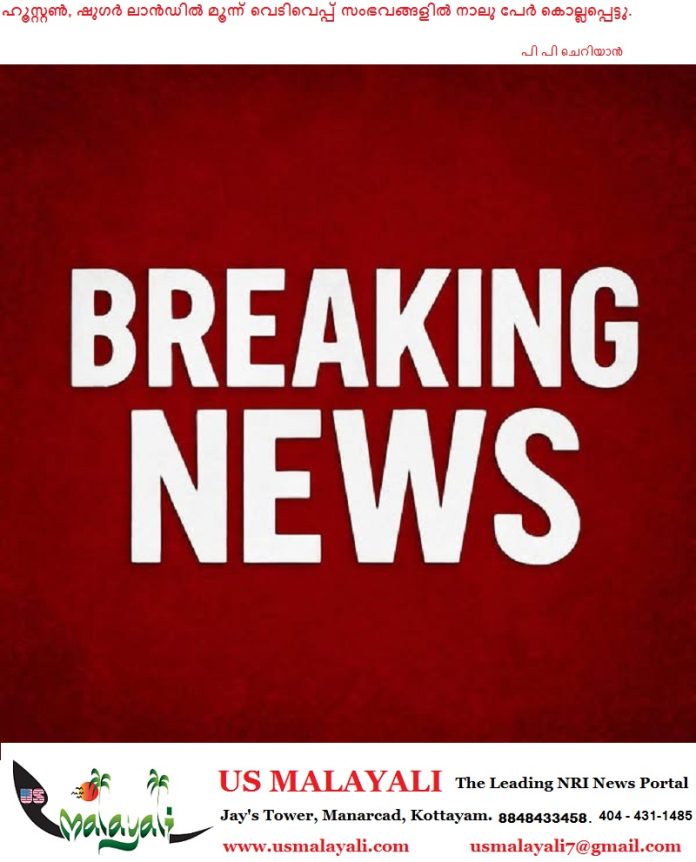ഹൂസ്റ്റൺ :ഹൂസ്റ്റൺ നഗരത്തിനും ഷുഗർ ലാൻഡിനും ഇടയിൽ നടന്ന മൂന്ന് വ്യത്യസ്ത വെടിവെപ്പ് സംഭവങ്ങളിൽ നാല് പേർ കൊല്ലപ്പെട്ടതായി പൊലീസ് അറിയിച്ചു. പ്രതി പിന്നീട് ആത്മഹത്യ ചെയ്തതായും സ്ഥിരീകരിച്ചു.