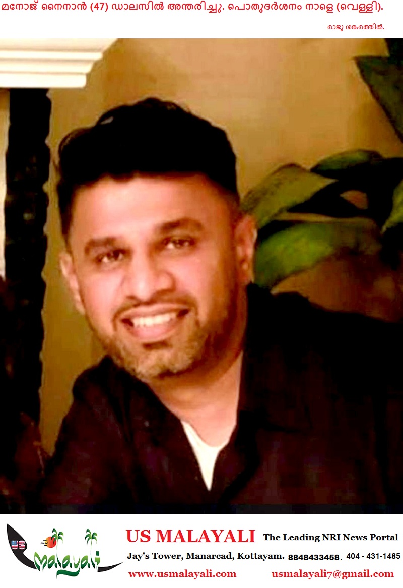 ഡാളസ് – ഫോർട്ട് വർത്ത്: തിരുവല്ല, പുളിക്കീഴ് മുളനിൽക്കുന്നതിൽ മാത്യു നൈനാന്റെയും, പൊന്നമ്മ നൈനാന്റെയും മകൻ, മനോജ് നൈനാൻ (47) ടെക്സാസിൽ അന്തരിച്ചു. ബെറ്റ്സിയാണ് ഭാര്യ. ഏക മകൾ: ലിലി. സ്മിത ഏക സഹോദരിയാണ്.