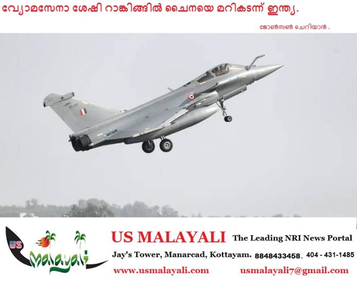 വ്യോമസേനാ ശേഷി റാങ്കിങ്ങിൽ ചൈനയെ മറികടന്ന് ഇന്ത്യ. വേൾഡ് ഡയറക്ടറി ഓഫ് മോഡേൺ മിലിട്ടറി എയർക്രാഫ്റ്റിന്റെ പുതിയ റാങ്കിങ്ങിൽ അമേരിക്കയ്ക്കും റഷ്യയ്ക്കും ശേഷം മൂന്നാം സ്ഥാനത്ത് ഇന്ത്യ എത്തി. ചൈന നാലാം സ്ഥാനത്തേക്ക് പിന്തള്ളപ്പെട്ടു. ലോകത്തെ 103 രാജ്യങ്ങളെയും കരസേന, നാവികസേന, മറൈൻ ഏവിയേഷൻ ശാഖകൾ ഉൾപ്പെടെ 129 വ്യോമ സേവനങ്ങളെയുമാണ് റാങ്കിങ്ങിന് പരിഗണിച്ചത്.