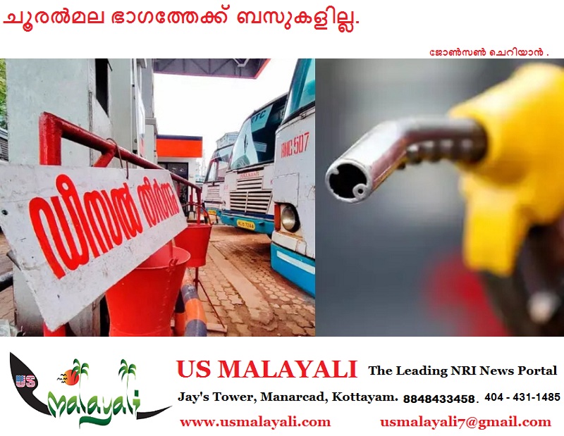 വയനാട് കൽപ്പറ്റ KSRTC ഡിപ്പോയിൽ ഡീസൽ പ്രതിസന്ധി രൂക്ഷം. 4 സർവീസുകൾ മുടങ്ങി.കൽപ്പറ്റയിൽ 18 ഓളം ബസ്സുകൾ ഓട്ടം നിർത്തി. വടുവൻച്ചാൽ, മാനന്തവാടി, വൈത്തിരി ഭാഗത്തേയ്ക്കുള്ള സർവ്വീസുകളാണ് മുടങ്ങിയത്.മുണ്ടക്കൈ, ചോലാടി മാനന്തവാടി എന്നിവ ഒരു ട്രിപ്പ് മാത്രം നടത്തി അവസാനിപ്പിച്ചു.