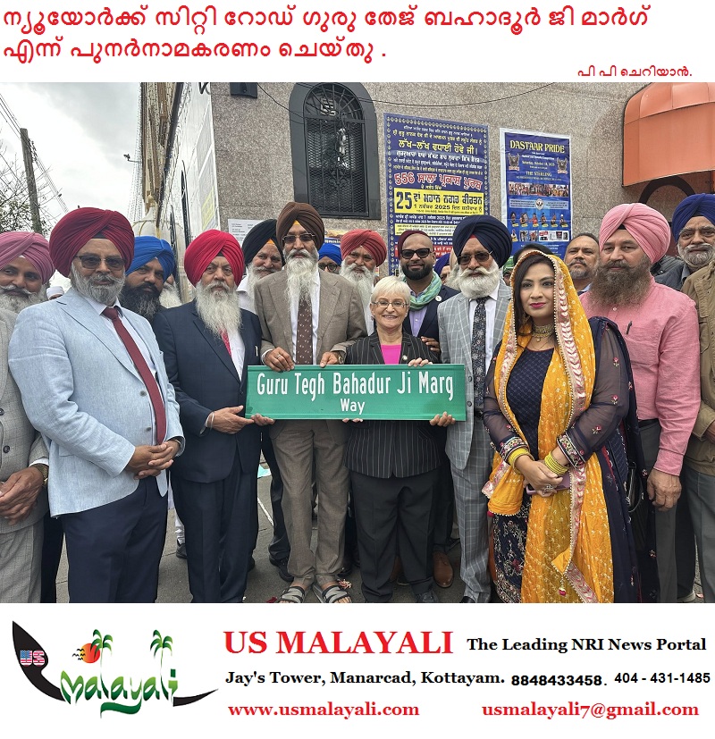 ന്യൂയോർക്ക്:ഒൻപതാമത്തെ സിഖ് ഗുരുവിന്റെ പാരമ്പര്യത്തെ ആദരിച്ചുകൊണ്ട് ന്യൂയോർക്കിലെ ഒരു റോഡിന്റെ ഒരു ഭാഗം ഗുരു തേജ് ബഹാദൂർ ജി മാർഗ് എന്ന് പുനർനാമകരണം ചെയ്തു.