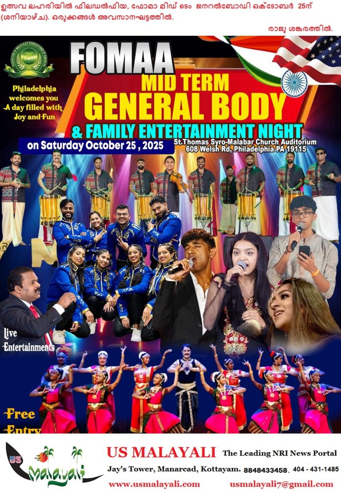 ഫിലഡൽഫിയ: ലോക മലയാളികളുടെ അഭിമാന സംഘടനയായ ഫോമയുടെ മിഡ് ടെം ജനറൽബോഡി യോഗം ഈ വരുന്ന ശനിയാഴ്ച. (ഒക്ടോബർ 25ന്) ഫിലഡൽഫിയ സീറോ മലബാർ കത്തോലിക്കാ പള്ളിയുടെ ഓഡിറ്റോറിയത്തിൽ വച്ച് നടത്തപ്പെടുന്നതിനുള്ള ഒരുക്കങ്ങൾ അവസാനഘട്ടത്തിൽ എത്തിച്ചേർന്നതായി സംഘാടകർ അറിയിച്ചു,